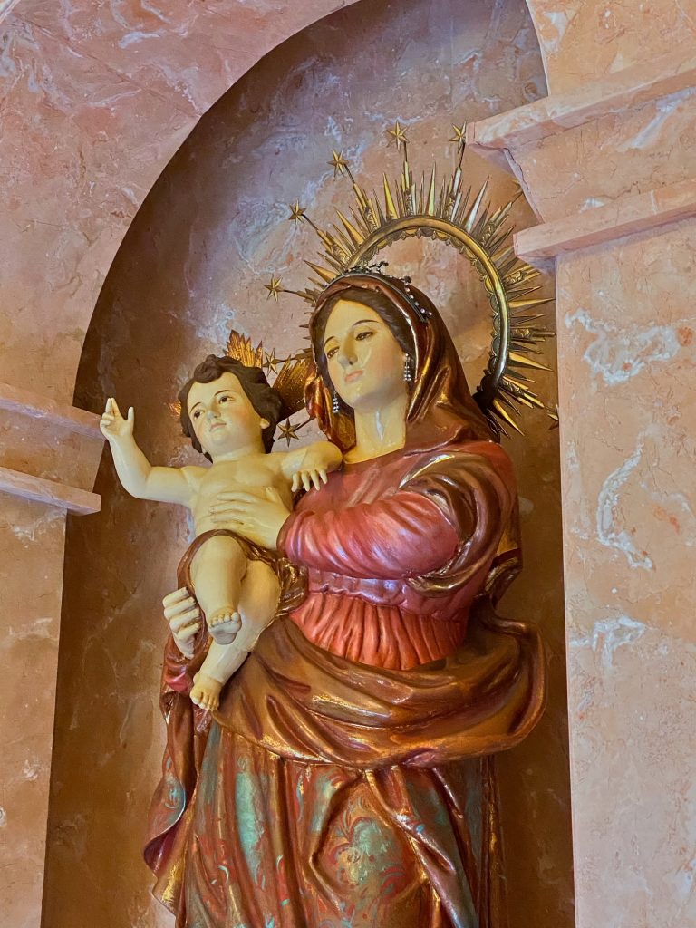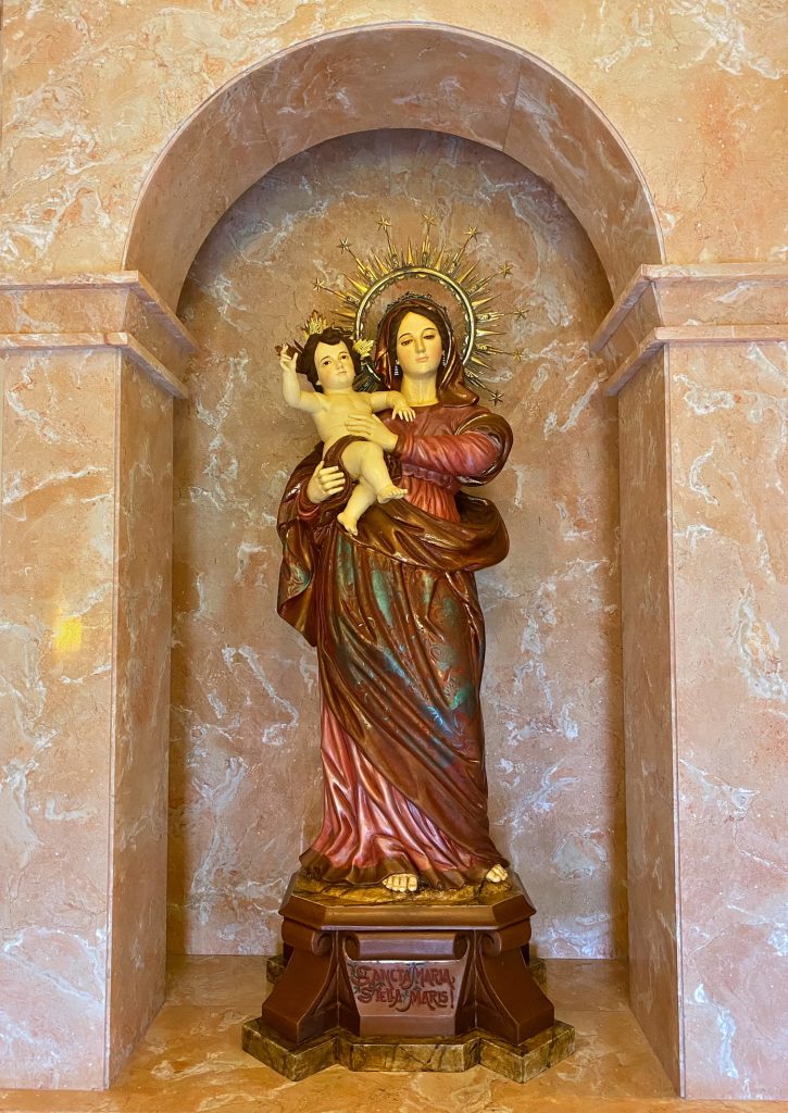Our Lady Stella Maris is the appellation of the image in the shrine of the Tagaytay Conference Center. The image is made of batikuling wood and carved by Maestro Ludring of the former shop of Maximo Vicente. Fina worked on the polychrome and the finishing of the beautiful image. It was the last work of Maestro Ludring, capping his illustrious career as a santero in the finest tradtion. Architecture is by Asian Architects.